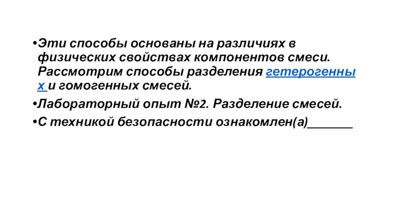 Эти способы основаны на различиях в физических свойствах компонентов смеси. Рассмотрим способы разделения гетерогенных и гомогенных смесей.Лабораторный опыт №2. Разделение смесей.С техникой безопасности