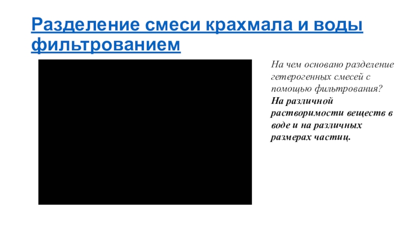 Разделение смеси крахмала и воды фильтрованиемНа чем основано разделение гетерогенных смесей с помощью фильтрования? На различной растворимости веществ