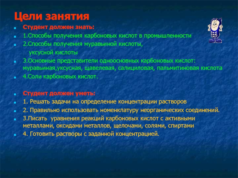 Цели занятияСтудент должен знать:1.Способы получения карбоновых кислот в промышленности2.Способы получения муравьиной кислоты, уксусной кислоты 3.Основные представители одноосновных карбоновых кислот: муравьиная,уксусная, щавелевая, салициловая, пальмитиновая кислота4.Соли карбоновых кислот.Студент должен уметь:1. Решать задачи на определение концентрации