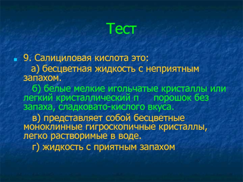Тест9. Салициловая кислота это:   а) бесцветная жидкость с неприятным запахом.   б) белые мелкие