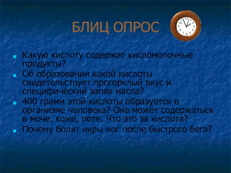 БЛИЦ ОПРОСКакую кислоту содержат кисломолочные продукты? Об образовании какой кислоты свидетельствует прогорклый вкус и специфический запах масла?