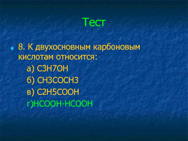 Тест8. К двухосновным карбоновым кислотам относится:   а) С3Н7ОН   б) СН3СОСН3   в)
