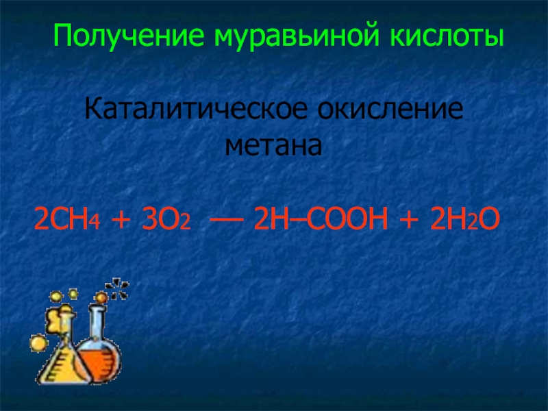Получение муравьиной кислоты  Каталитическое окисление метана 2CH4 + 3O2  –– 2H–COOH + 2H2O