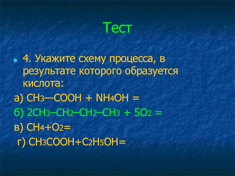 Тест4. Укажите схему процесса, в результате которого образуется кислота:а) СH3—COОH + NH4OH = б) 2CH3–CH2–CH2–CH3 + 5O2