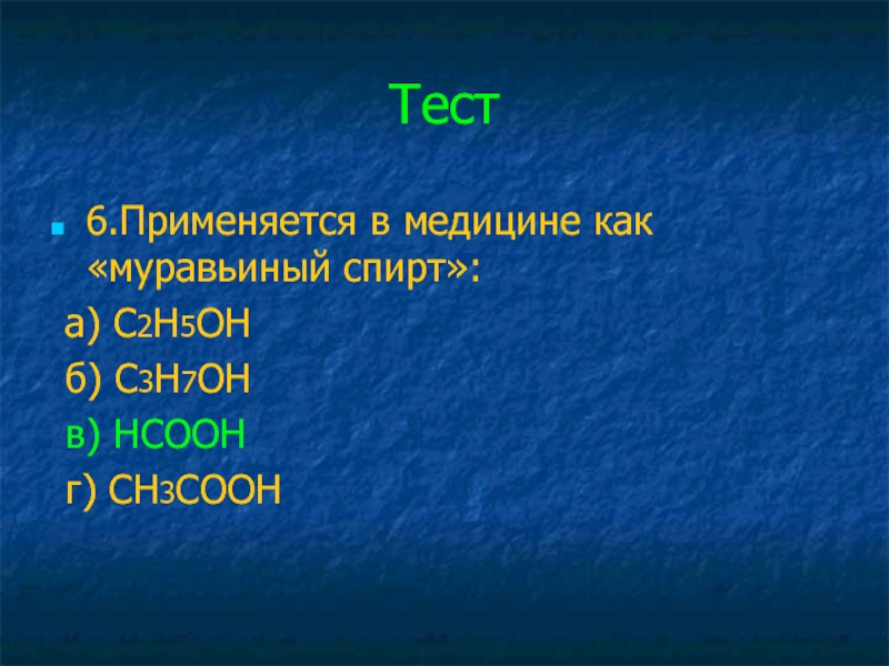 Тест6.Применяется в медицине как «муравьиный спирт»: а) С2Н5ОН б) С3Н7ОН в) НСООН г) СН3СООН