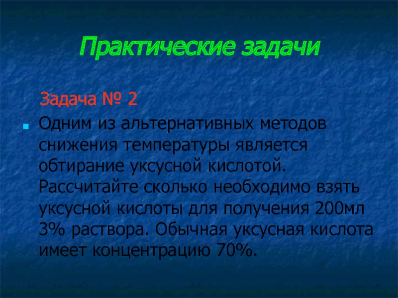 Практические задачи  Задача № 2Одним из альтернативных методов снижения температуры является обтирание уксусной кислотой. Рассчитайте сколько