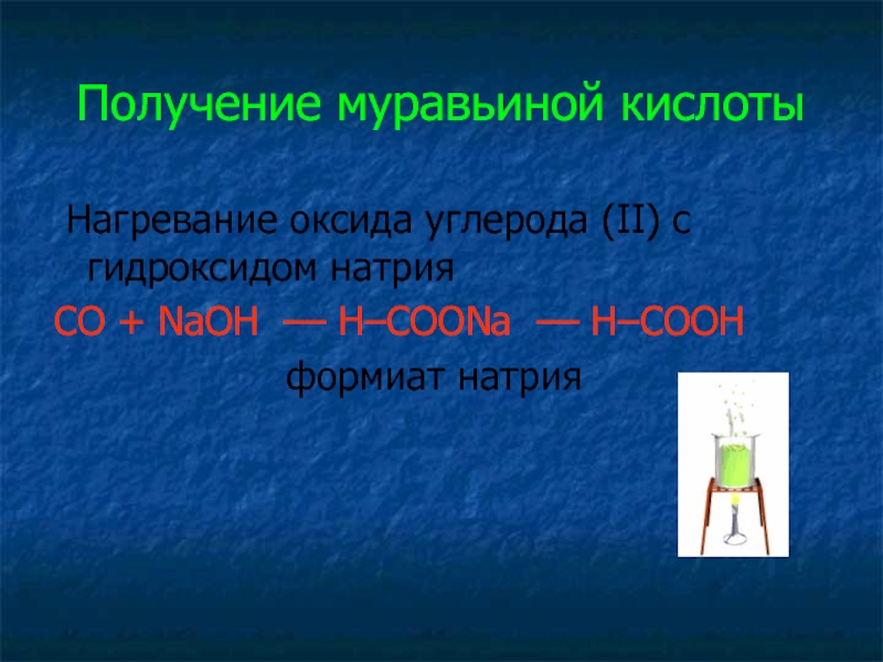 Получение муравьиной кислоты Нагревание оксида углерода (II) c гидроксидом натрияCO + NaOH  –– H–COONa  –– H–COOH
