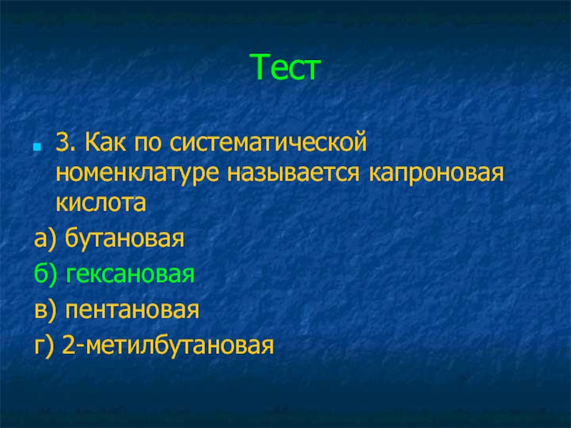 Тест3. Как по систематической номенклатуре называется капроновая кислотаа) бутановаяб) гексановаяв) пентановаяг) 2-метилбутановая