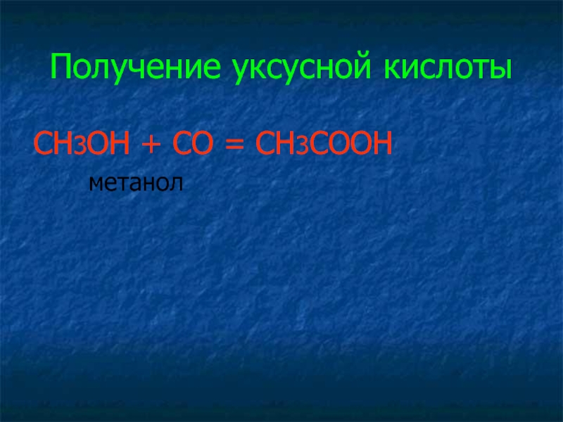 Получение уксусной кислотыCH3OH + CO = CH3COOH    метанол
