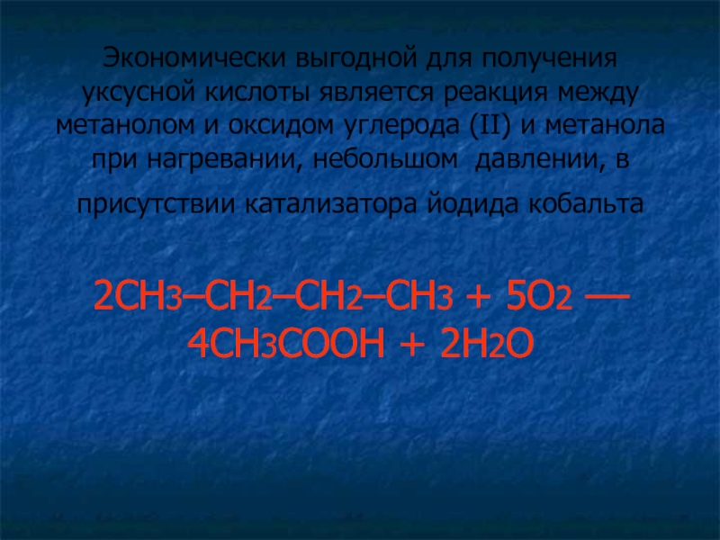 метанолом и оксидом углерода (II) и метанола при нагревании, небольшом давлении, в присутствии катализатора йодида кобальта 2CH3–CH2–CH2–CH3 + 5O2 –– 4CH3COOH + 2H2O