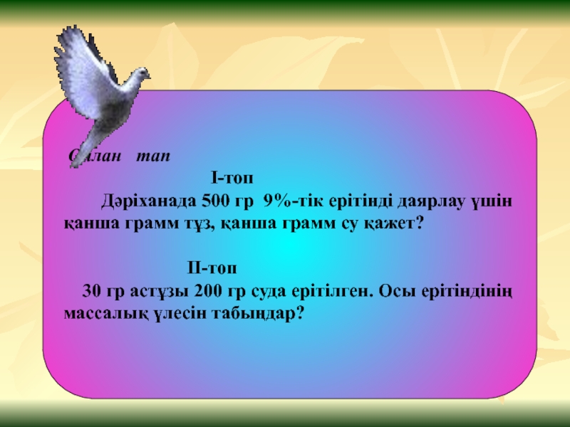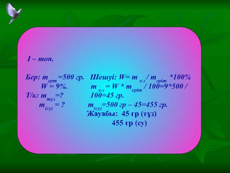 I – топ.  Бер: mерт =500 гр.  Шешуі: W= m е.з / mеріт *100%