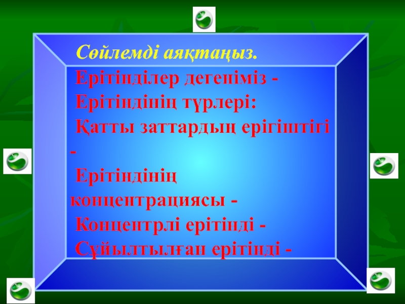 Сөйлемді аяқтаңыз. Ерітінділер дегеніміз - Ерітіндінің түрлері: Қатты заттардың ерігіштігі - Ерітіндінің концентрациясы - Концентрлі ерітінді