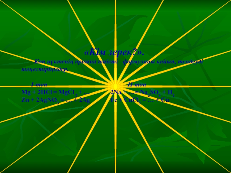 «Кім зерек?».     Көп нүктенің орнына тиісті  формуланы қойып, теңдеуді