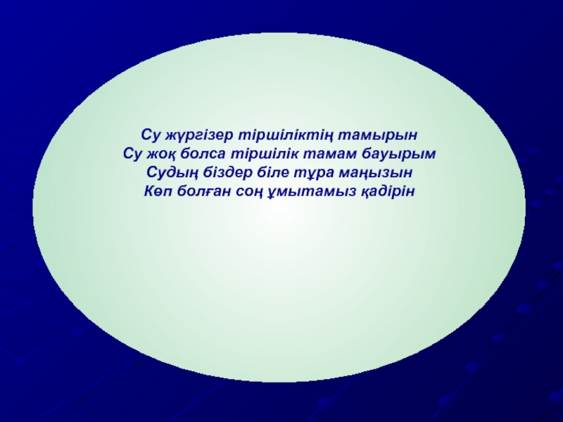 Су жүргізер тіршіліктің тамырынСу жоқ болса тіршілік тамам бауырымСудың біздер біле тұра маңызынКөп болған соң ұмытамыз қадірін