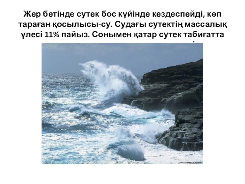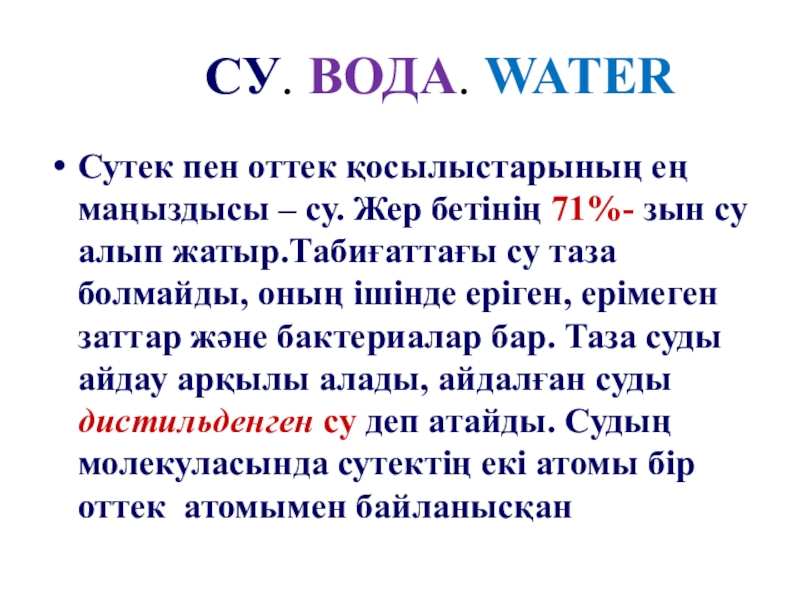 – су. Жер бетінің 71%- зын су алып жатыр.Табиғаттағы су таза болмайды, оның ішінде еріген, ерімеген заттар және бактериалар бар. Таза суды айдау арқылы алады, айдалған суды дистильденген су деп атайды. Судың молекуласында сутектің екі атомы бір оттек атомымен байланысқан