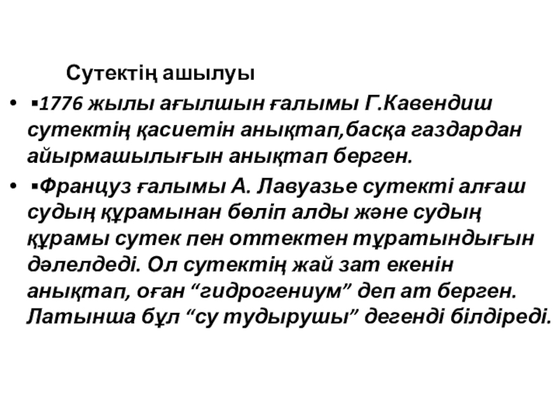 ▪1776 жылы ағылшын ғалымы Г.Кавендиш сутектің қасиетін анықтап,басқа