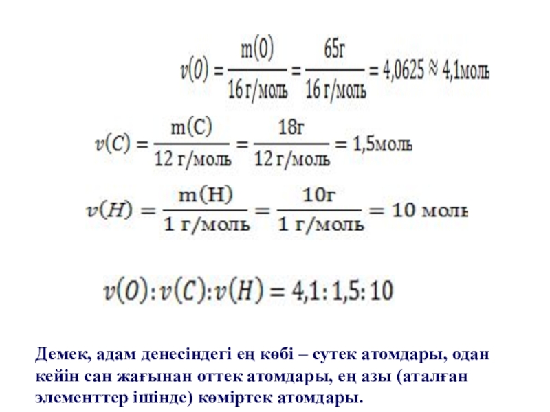құрамындағы әр элемент атомдары сандарының қатынасы олардың зат мөлшерлерінің қатынасындай. Оны табу үшін адам денесінің 100 г үлгісін қарастырған ыңғайлы. Сонда 100 г үлгідегі әр элемент атомдарының жалпы массасы сан жағынан сол элементтің проценттік мөлшеріне тең болады.