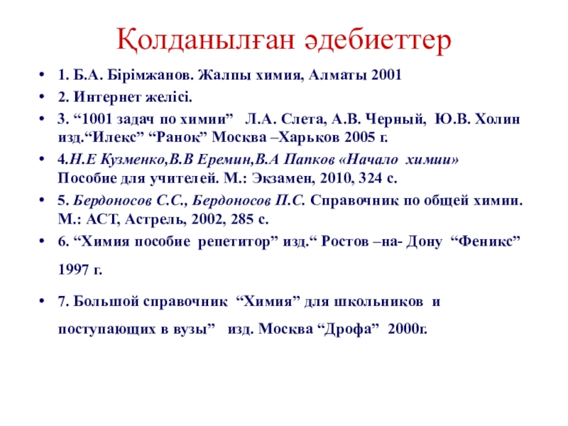 1. Б.А. Бірімжанов. Жалпы химия, Алматы 2001