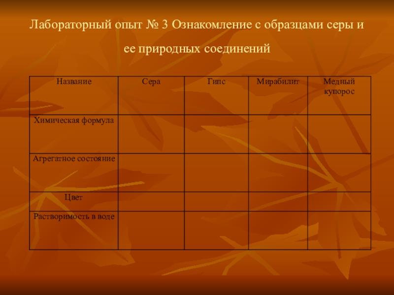 Слайд 7Лабораторный опыт № 3 Ознакомление с образцами серы и ее природных