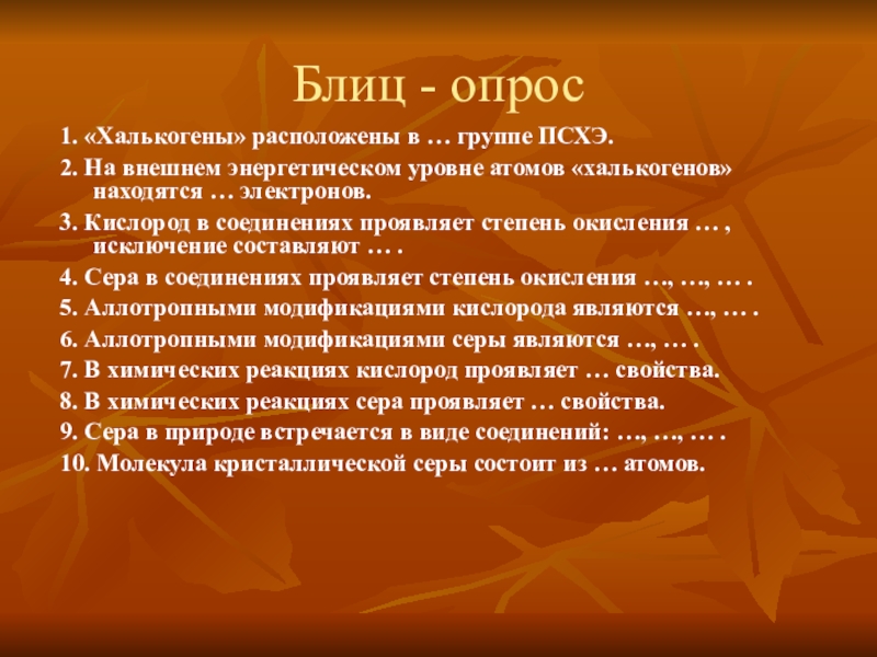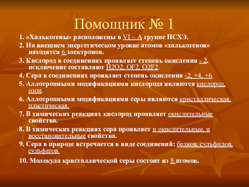 1. «Халькогены» расположены в VI – А группе ПСХЭ.