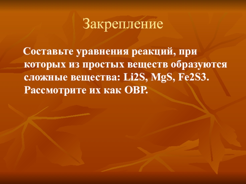 сложные вещества: Li2S, MgS, Fe2S3. Рассмотрите их как ОВР.