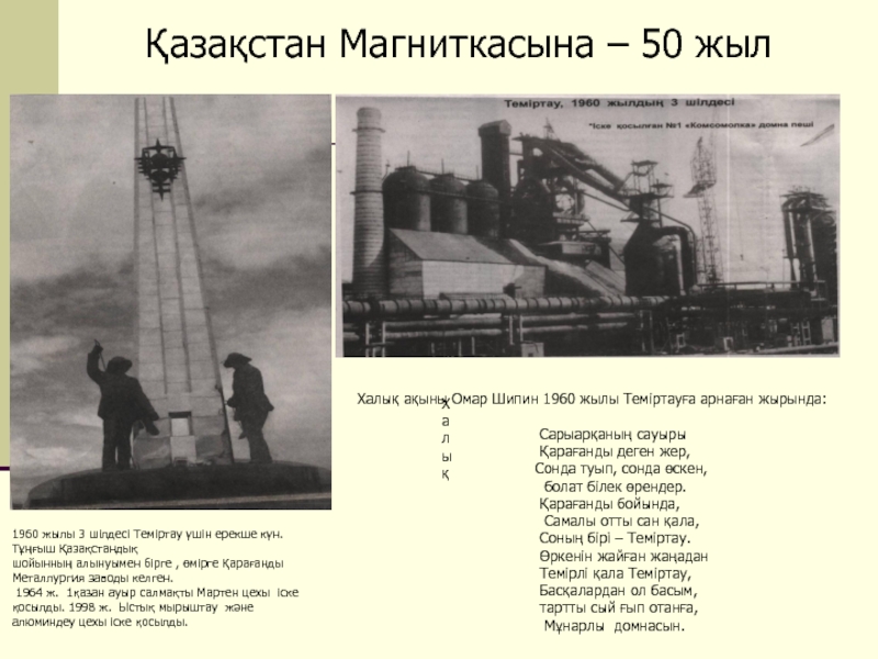 Халық ақыны Омар Шипин 1960 жылы Теміртауға арнаған жырында: