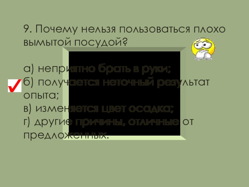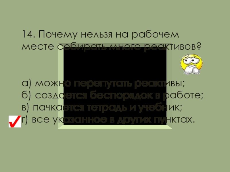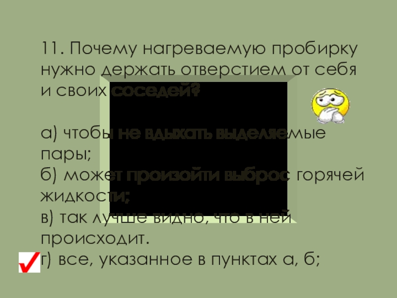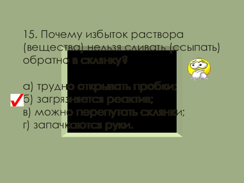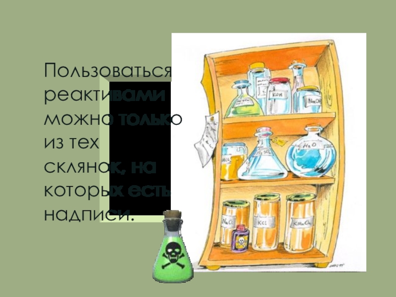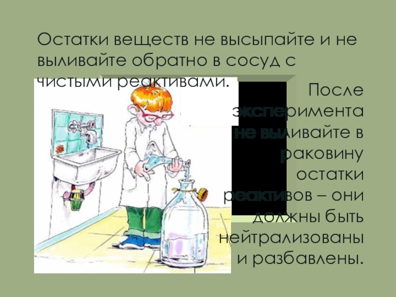 Остатки веществ не высыпайте и не выливайте обратно в сосуд с чистыми реактивами.