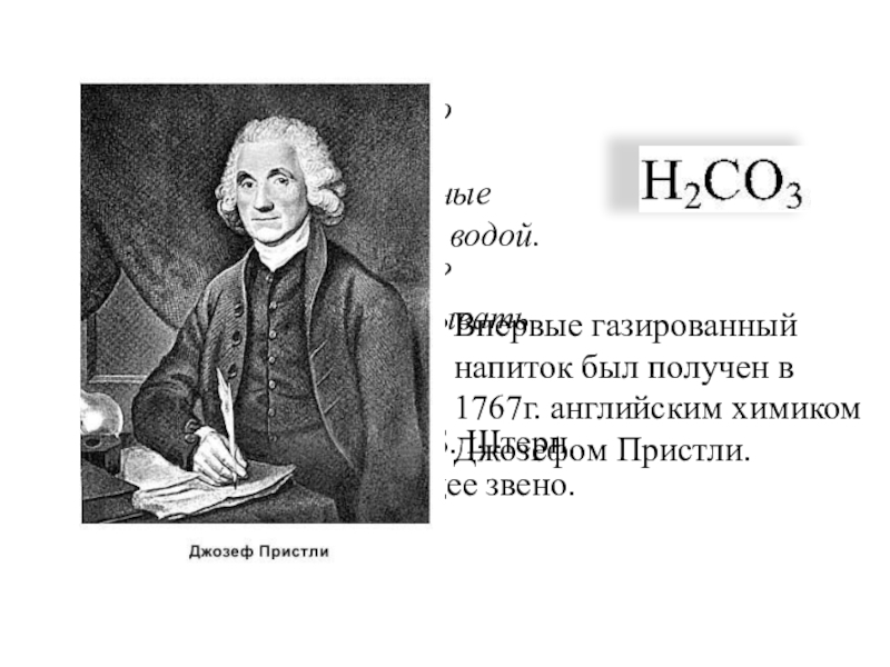 Впервые газированный напиток был получен в 1767г. английским химиком Джозефом Пристли.