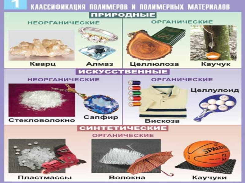 полимерам относятся многочисленные природные соединения: белки, нуклеиновые кислоты, полисахариды, каучук и другие органические вещества. В большинстве случаев понятие относят к органическим соединениям, однако существует и множество неорганических полимеров. Большое число полимеров получают синтетическим путём на основе простейших соединений элементов природного происхождения путём реакций полимеризации, поликонденсации и химических превращений. Названия полимеров образуются из названия мономера с приставкой поли-: полиэтилен, полипропилен, поливинилацетат...