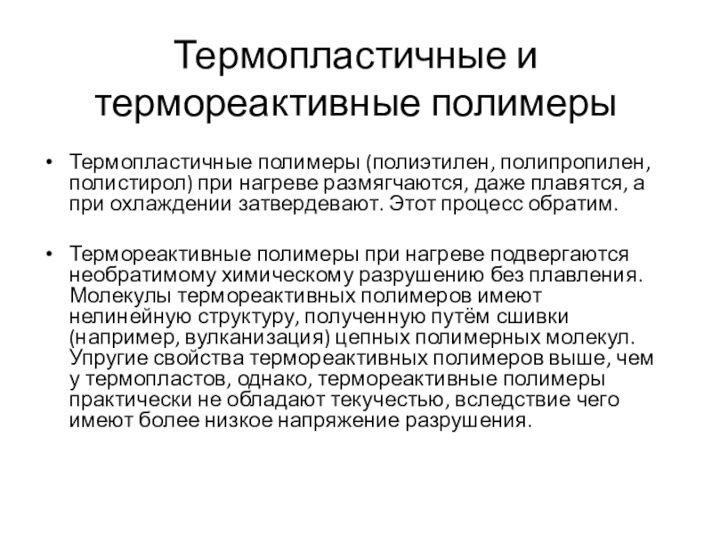 Термореактивные полимеры при нагреве подвергаются необратимому химическому разрушению без плавления. Молекулы термореактивных полимеров имеют нелинейную структуру, полученную путём сшивки (например, вулканизация) цепных полимерных молекул. Упругие свойства термореактивных полимеров выше, чем у термопластов, однако, термореактивные полимеры практически не обладают текучестью, вследствие чего имеют более низкое напряжение разрушения.