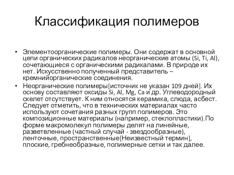 Неорганические полимеры[источник не указан 109 дней]. Их основу составляют оксиды Si, Al, Mg, Ca и др. Углеводородный скелет отсутствует. К ним относятся керамика, слюда, асбест.Следует отметить, что в технических материалах часто используют сочетания разных групп полимеров. Это композиционные материалы (например, стеклопластики).По форме макромолекул полимеры делят на линейные, разветвленные (частный случай - звездообразные), ленточные, пространственные[Неизвестный термин], плоские, гребнеобразные, полимерные сетки и так далее.