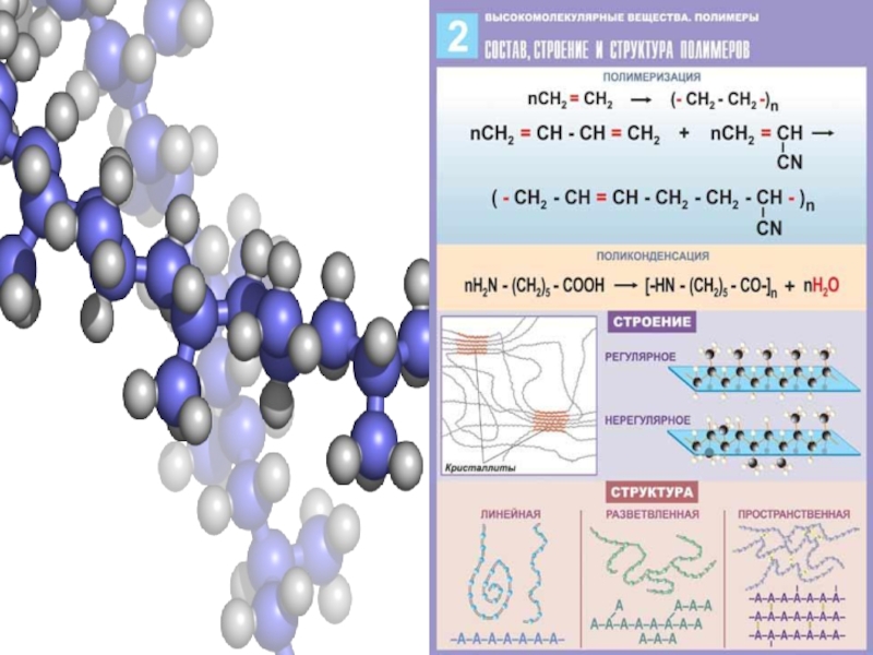 включающий несколько атомов. Полимеры состоят из большого числа повторяющихся группировок (звеньев) одинакового строения, называют например поливинилхлорид (—СН2—СНСl—)n, каучук натуральный и др. Высокомолекулярные соединения, молекулы которых содержат несколько типов повторяющихся группировок, называют сополимерами.