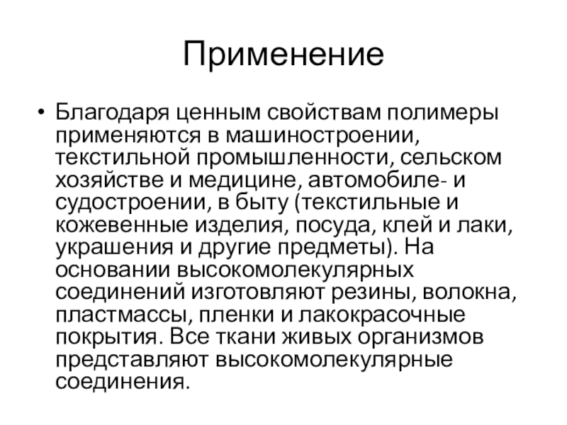 и медицине, автомобиле- и судостроении, в быту (текстильные и кожевенные изделия, посуда, клей и лаки, украшения и другие предметы). На основании высокомолекулярных соединений изготовляют резины, волокна, пластмассы, пленки и лакокрасочные покрытия. Все ткани живых организмов представляют высокомолекулярные соединения.