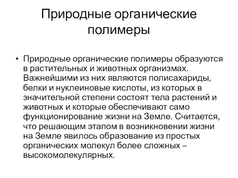 Важнейшими из них являются полисахариды, белки и нуклеиновые кислоты, из которых в значительной степени состоят тела растений и животных и которые обеспечивают само функционирование жизни на Земле. Считается, что решающим этапом в возникновении жизни на Земле явилось образование из простых органических молекул более сложных – высокомолекулярных.