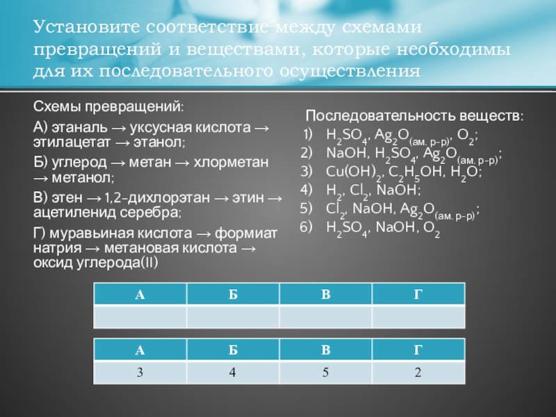 Установите соответствие между схемой химических превращений и формулами пропущенных в ней веществ
