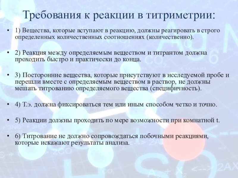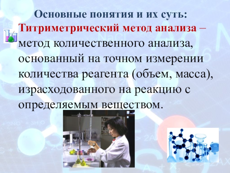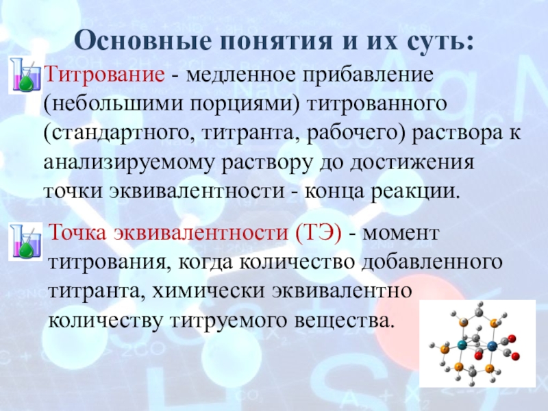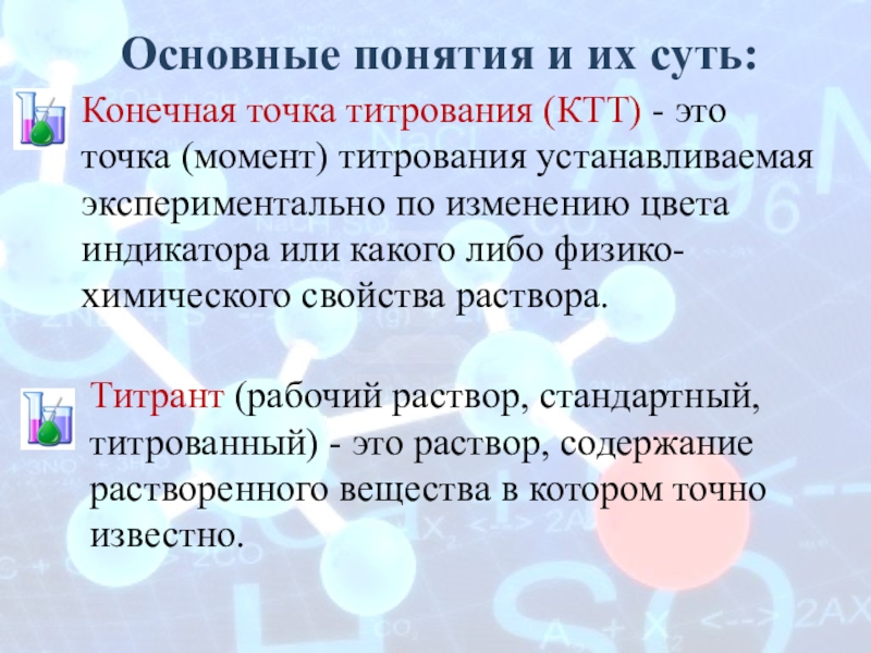 Титрант (рабочий раствор, стандартный, титрованный) - это раствор, содержание растворенного вещества в котором точно известно.