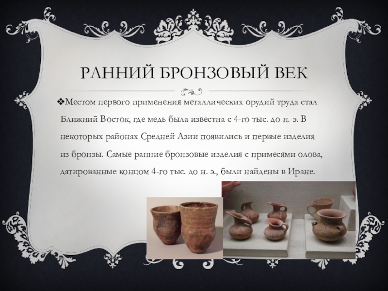 Ранний Бронзовый ВекМестом первого применения металлических орудий труда стал Ближний Восток, где медь была известна с 4-го
