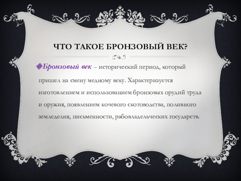 ЧТО ТАКОЕ БРОНЗОВЫЙ ВЕК?Бронзовый век – исторический период, который пришел на смену медному веку. Характеризуется изготовлением и использованием бронзовых орудий труда и оружия, появлением кочевого скотоводства, поливного земледелия, письменности, рабовладельческих государств.