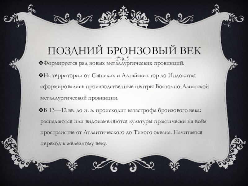 Поздний бронзовый векФормируется ряд новых металлургических провинций.На территории от Саянских и Алтайских гор до Индокитая сформировались производственные