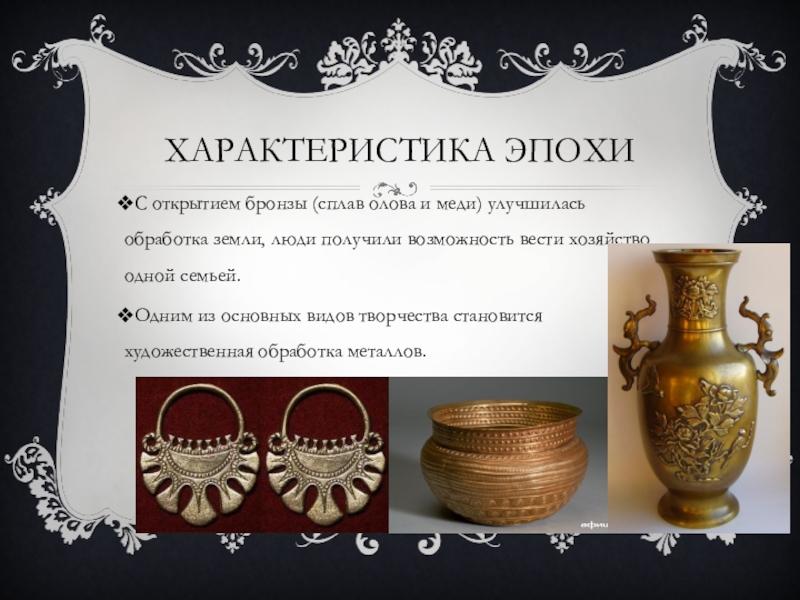 Характеристика эпохиС открытием бронзы (сплав олова и меди) улучшилась обработка земли, люди получили возможность вести хозяйство одной