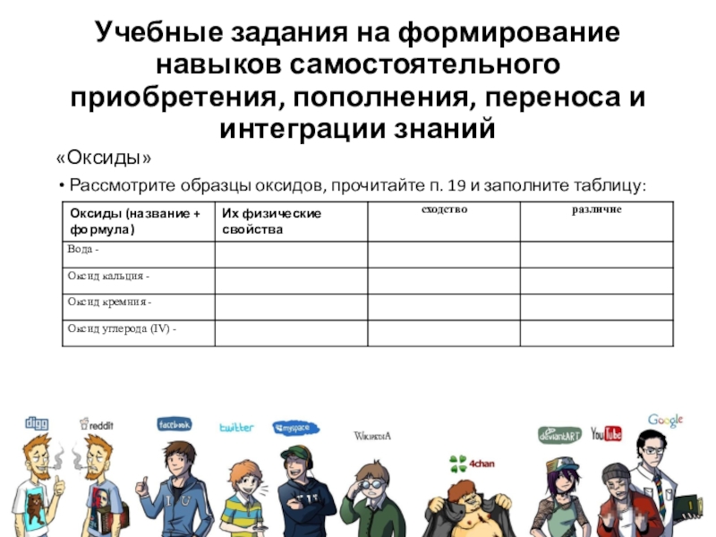 Рассмотрите образцы оксидов, прочитайте п. 19 и заполните таблицу: