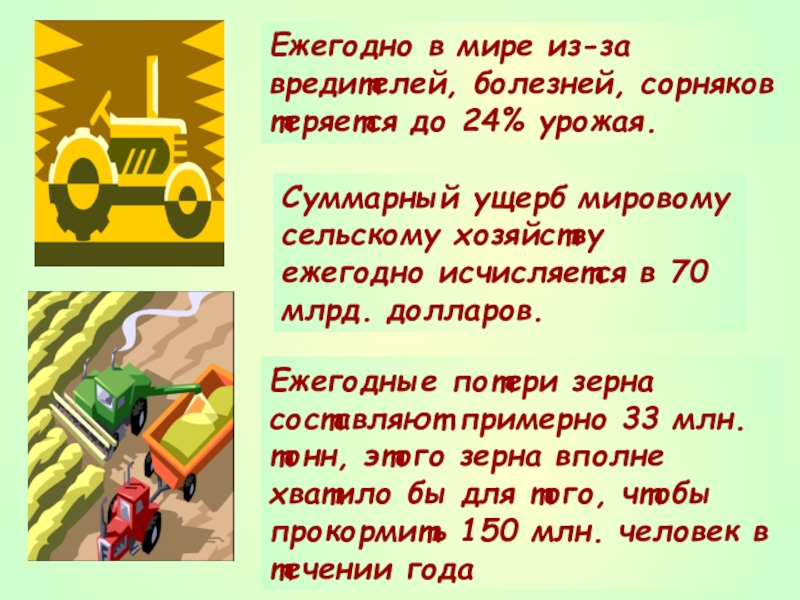 Ежегодные потери зерна составляют примерно 33 млн. тонн, этого зерна вполне хватило бы для того, чтобы прокормить 150 млн. человек в течении года