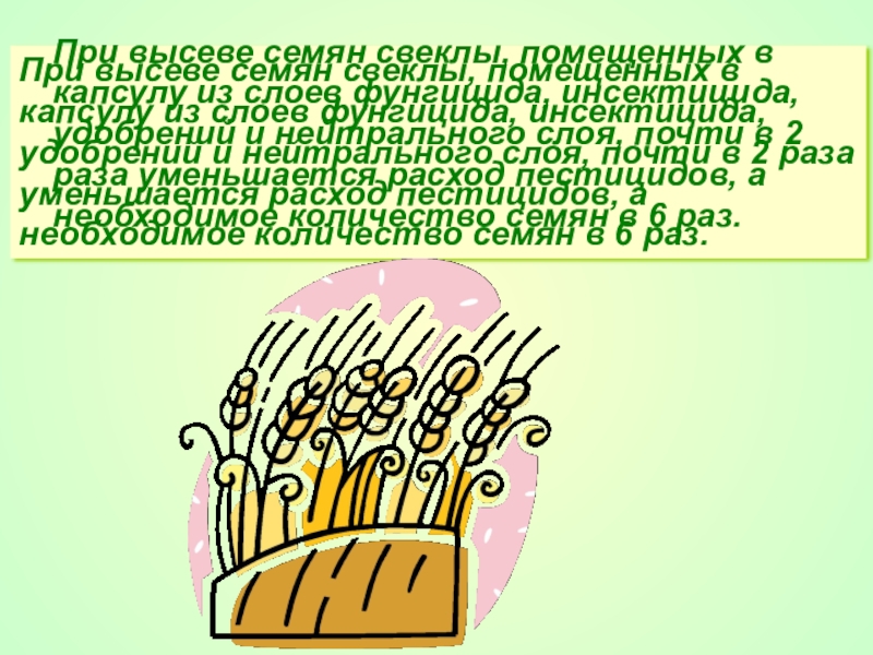 При высеве семян свеклы, помещенных в капсулу из слоев фунгицида, инсектицида, удобрений и нейтрального слоя, почти в 2 раза уменьшается расход пестицидов, а необходимое количество семян в 6 раз.