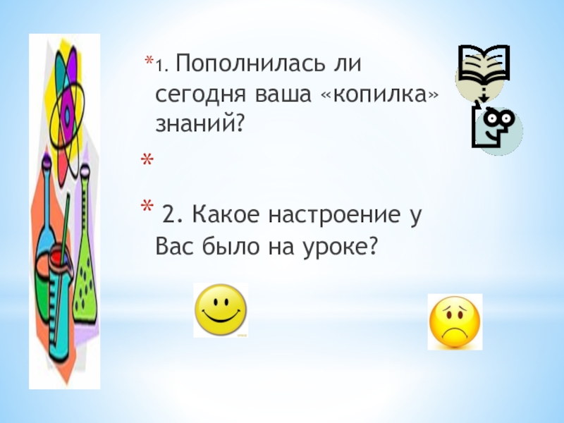 1. Пополнилась ли сегодня ваша «копилка» знаний?  2. Какое настроение у Вас было на уроке?