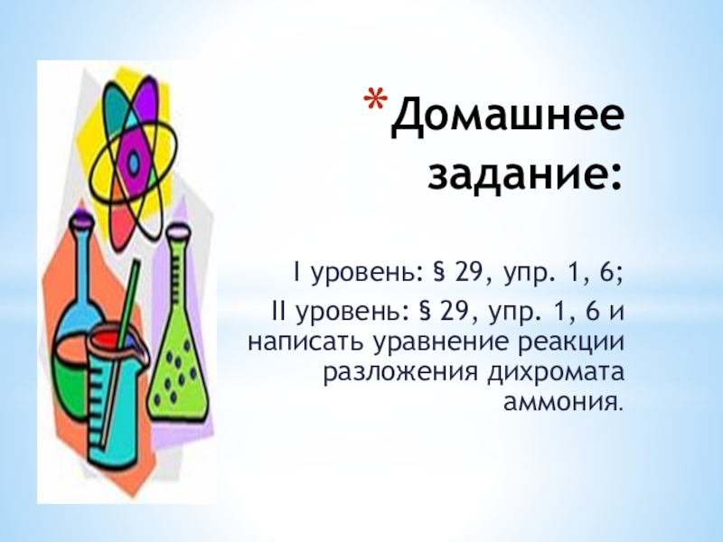 уровень: § 29, упр. 1, 6 и написать уравнение реакции разложения дихромата аммония.