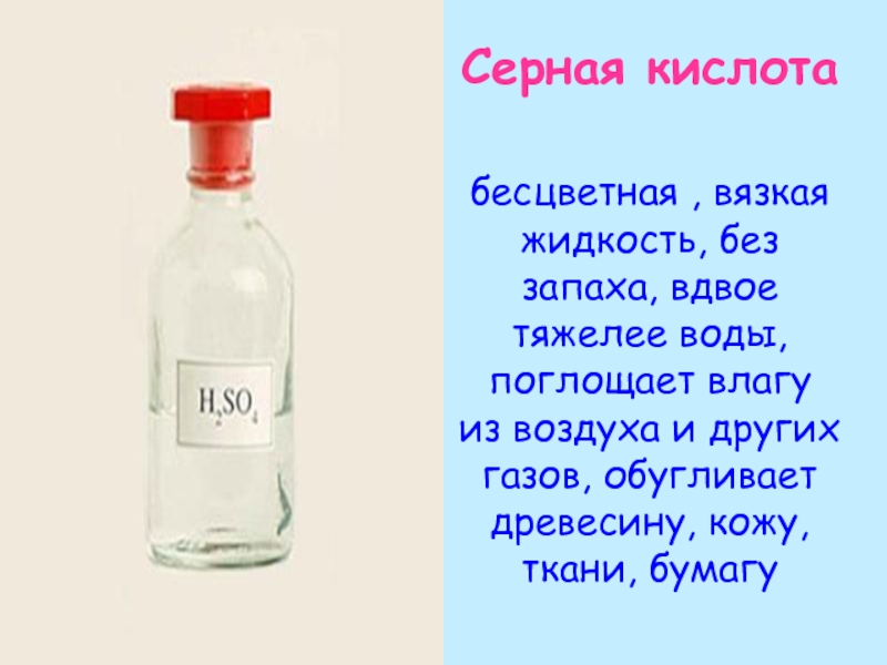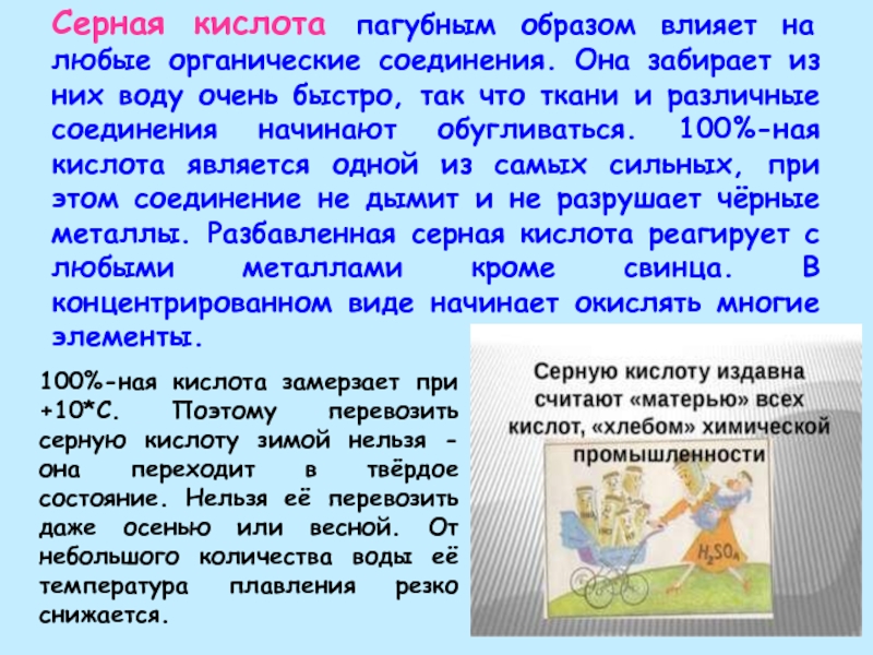 100%-ная кислота замерзает при +10*С. Поэтому перевозить серную кислоту зимой нельзя - она переходит в твёрдое состояние. Нельзя её перевозить даже осенью или весной. От небольшого количества воды её температура плавления резко снижается.