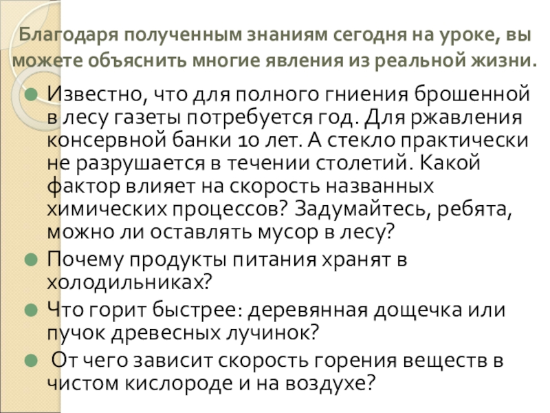Известно, что для полного гниения брошенной в лесу газеты потребуется год. Для ржавления консервной банки 10 лет. А стекло практически не разрушается в течении столетий. Какой фактор влияет на скорость названных химических процессов? Задумайтесь, ребята, можно ли оставлять мусор в лесу?