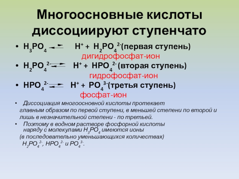 Слайд 14Многоосновные кислоты диссоциируют ступенчато