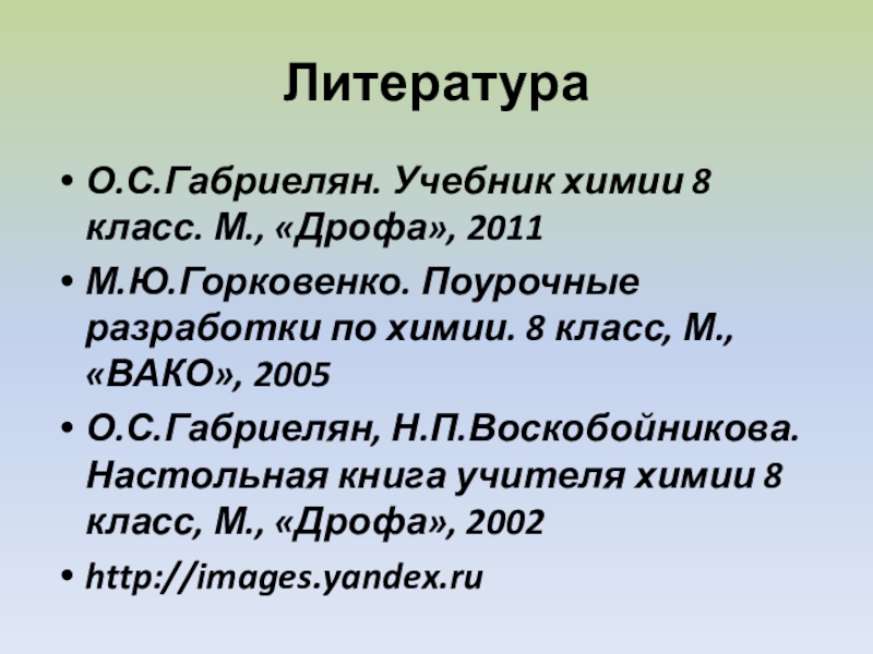 О.С.Габриелян. Учебник химии 8 класс. М., «Дрофа», 2011
