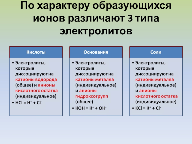 Слайд 13По характеру образующихся ионов различают 3 типа электролитов